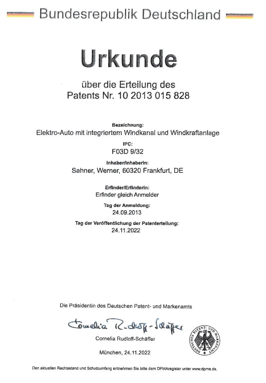Unter der Patent Nr. 10 2013 015 828 B4 wurde das Konzept am 24.11.2022 von der Bundesrepublik Deutschland patentiert.